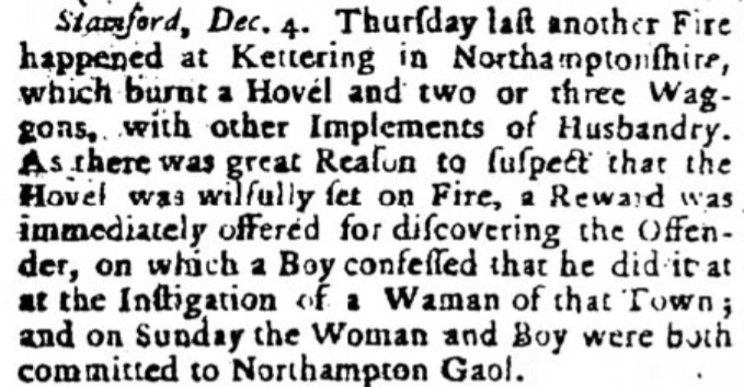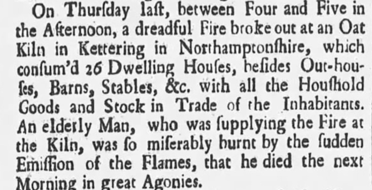 The fire started in a kiln used for drying oats. A map of Kettering from the 1720s shows a kiln near the end of what is now Lower Street. The close together buildings and land seem to match the descriptions of what was burned in the fire.