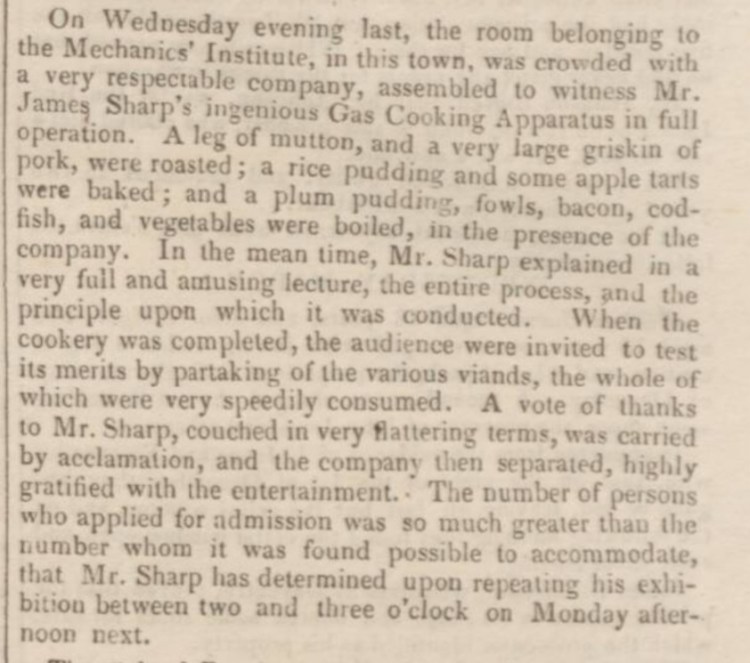 Inside a lecture room belonging to the town’s Mechanics’ Institute, a crowd gathered to watch what must surely count as the world’s first gas-cooked dinner party.