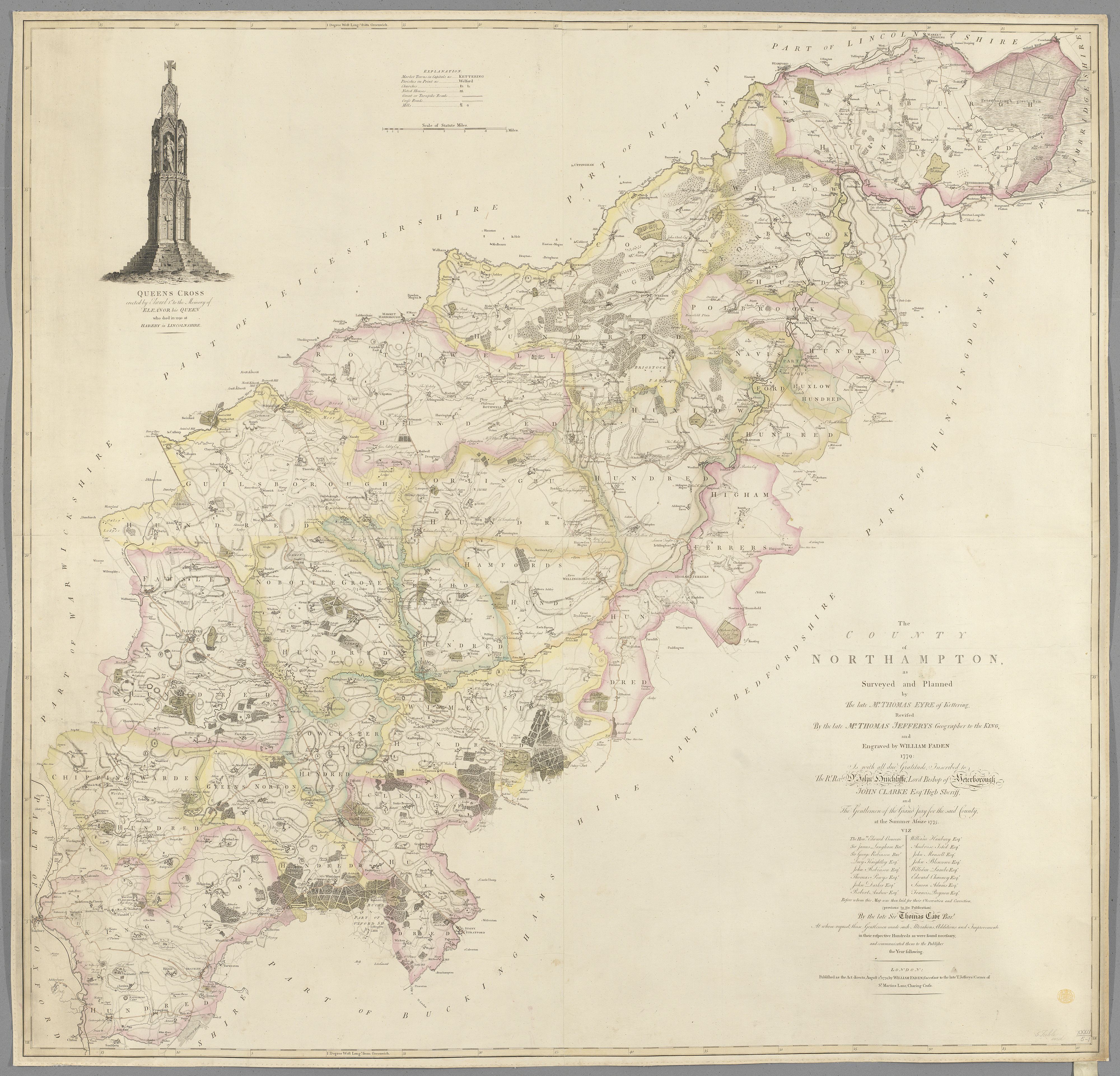 Reputedly the first large scale map of Northamptonshire, it was surveyed and planned by Thomas Eyre of Kettering, and revised by Thomas Jeffreys, who was Geographer to King George III.
